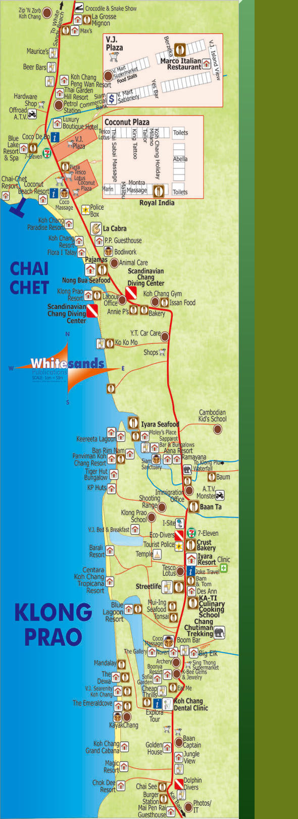 Koh Chang เกาะช้าง Ko Chang liegt im Golf von Thailand an der Ostküste Thailands nahe der Grenze zu Kambodscha. Koh Chang ist die dritt größte Insel Thailands.Die Insel ist etwa 30 Kilometer lang und maximal 13 Kilometer breit. Khlong Phrao Beach – Hat Khlong Phraoหาดคลองพร้าว Der Klong Prao Beach ist der längste und weitläufigste Strand. Zwei Flüsse teilen den Klong Prao Beach in drei Strand abschnitte. Der nördliche Teil erstreckt sich bis zur Flussmündung bei Ban Chivit, der mittlere Abschnitt endet am Centara Koh Chang Resort , der südliche Abschnitt am Magic Resort . Der gesamte Strand hat hellen Sand, fällt flach ab und wird von Kokos Palmen und Bäumen gesäumt. Zum Einkaufen findet man Supermärkten, Textilien-, Souvenir-Shops und auch Apotheken. Im Zentrum gibt es einen kleinen Nachtmarkt.
