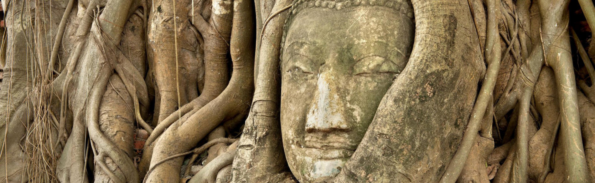 berühmte Baum, der um den Kopf eines Buddha