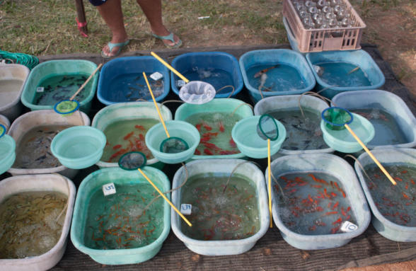 statt. Unter Palmblattdächern, Sonnenschirmen oder Plastikplanen