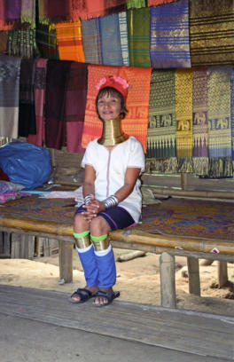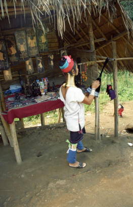 Die Padung Frauen umgeben ihren Hals mit Messingringen.