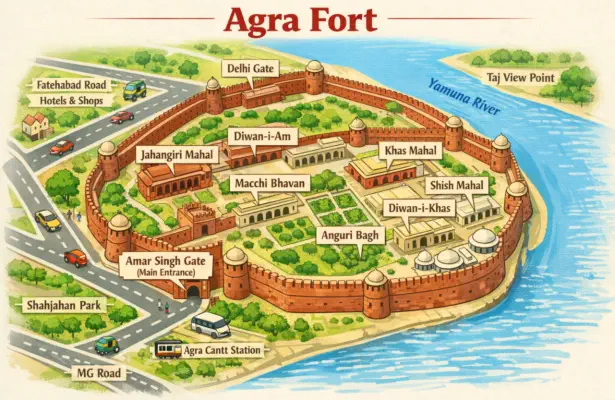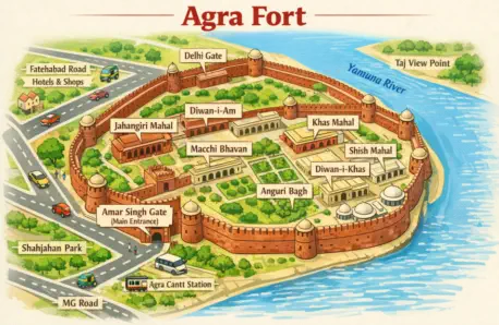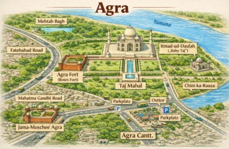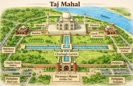 Die Anlage liegt direkt am Ufer des Yamuna-Flusses und nur wenige Kilometer vom weltberühmten Taj Mahal entfernt.