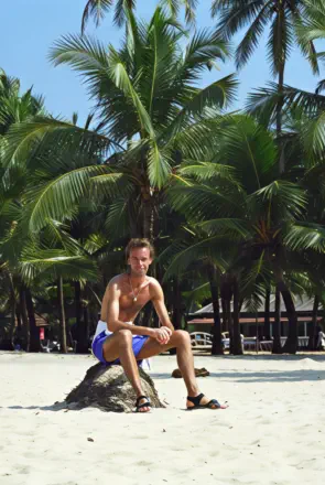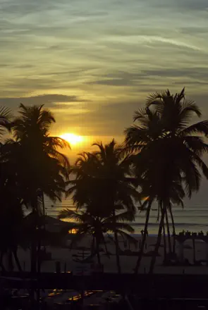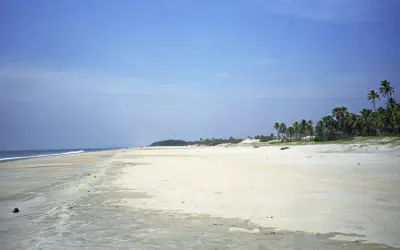 Die weitläufige Küste mit goldenen Sandstränden erstreckt sich über mehrere Kilometer und wird von Kokospalmen gesäumt,