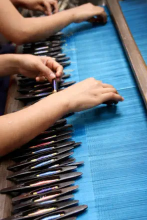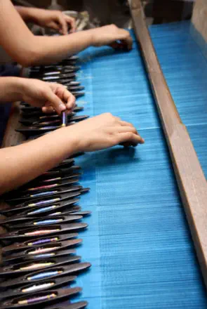 Die Weber verwenden traditionelle Handwebstühle, um aus Seidenfäden kunstvolle Muster und Textilien zu fertigen.