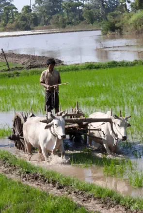 Die Stadt ist von Reisfeldern und Flussarmen umgeben, was ihr eine ruhige und malerische Atmosphäre verleiht.